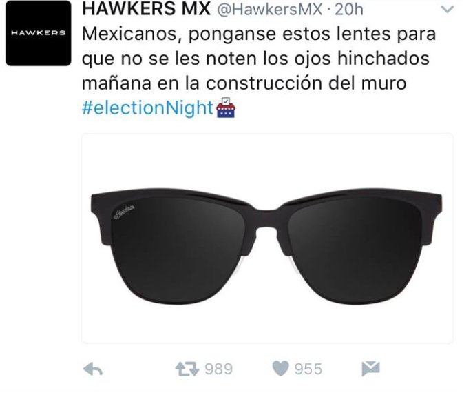 Hasta que un tuit destruyó estas colaboraciones, el motivo fue por la victoria de Donald Trump en las elecciones de Estados Unidos, en esos años se vivía momentos difíciles debido a los altos comentarios racistas hacia los mexicanos que radican en estados unidos, por lo que se comenzaron a crear diferentes tipos de memes y comentarios negativos en redes sociales. Esta compañía lo vio como una gran oportunidad para destacar y ser polémico. Pero no siempre es bueno utilizar este tipo de noticias para crear campañas publicitarias.